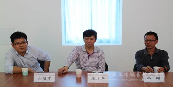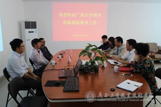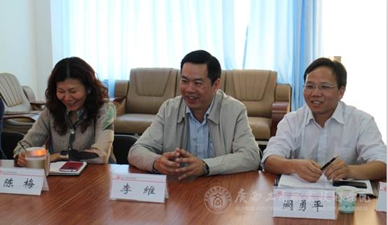 广西高等教育学会科研管理研究专业委员会(以下简称科研管理会)由广西区教育厅科研管理处主管,其一年一度的会议是整个广西区科研工作者的大聚会,是展示科研成果、交流科研工作管理经验与体会的重要平台。2015年4月13日下午,科研管理会秘书长、广西大学科技处廖小平一行三人莅临我院开展2015年科研管理会年会调研及双方科研管理工作经验交流。我院在学术交流中心召开欢迎会,热烈欢迎廖小平一行莅临指导。参加本次欢迎会的我院人员有学院领导李维副院长,高职研究所阙勇平所长及副所长叶桂中、张锋雄,学院学报主编陈梅等。