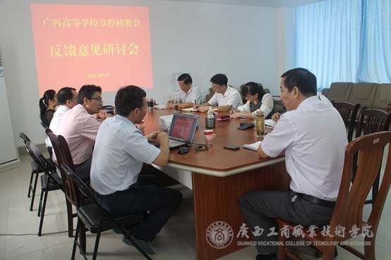 根据9月15日下午广西高等学校章程核准委员会第五次会议专家反馈意见及学院9月16日2015年第14期院长办公会工作要求,学院章程由阙勇平所长按照广西高校章程核准委员会第五次会议的精神和要求先进行初步修改,然后交由学院章程文稿工作组集体研讨。9月21日上午,章程修订文稿工作组在校本部学术交流中心再次召开工作会议,会议由学院分管章程修订工作的副院长李维教授主持,与会的领导有教务科研处处长韦胜强教授、宣传部部长孙德江教授、党(院)办蒋百平主任、财务处覃超颖处长、继续教育部林雯主任、现教中心覃远霞教授、高职研究所所长阙勇平教授、学生工作处张居设副处长等学院章程修订文稿工作组成员。